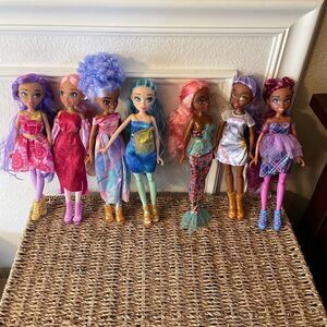 Excellent condition. My granddaughter was/is afraid of their eyes(?!). They are beautiful dolls with gorgeous hair! Clean home! Set of 7. All come with their outfits and shoes, except the mermaid! Mermaids don’t need shoes!