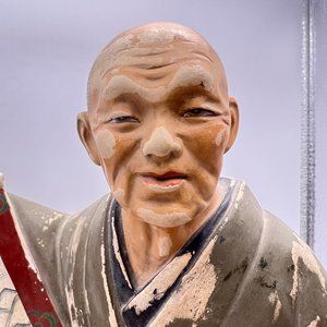 A wonderful mid-century Hakata Urasaki Clay Doll - Man holding an ancient scroll painting. On the underside of the old man is the original stickers.