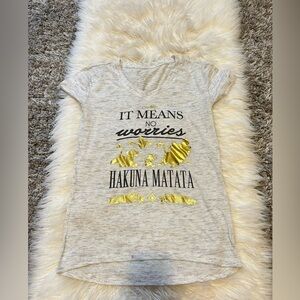 Embrace the carefree spirit with this stylish gray Hakuna Matata t-shirt. The soft fabric and comfortable fit make it perfect for everyday wear. The iconic phrase and gold graphic add a touch of Disney magic to your wardrobe. Perfect for fans of The Lion King, this tee is a must-have for a casual and fun look.