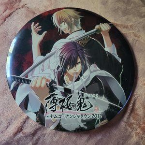 Large decoration featuring Hakuoki characters Saito Hajime and Kazama Chikage. Can badge style. Character with swords image. Says "Hakuoki in Namco Namjatown 2012" in Japanese. Can be displayed on a table or hung. Scratched. Approximately 10 in (25 cm) diameter.