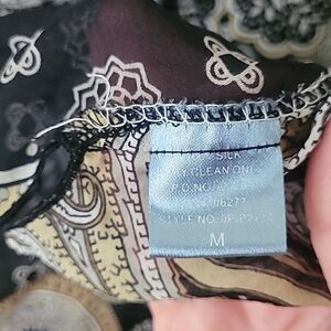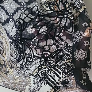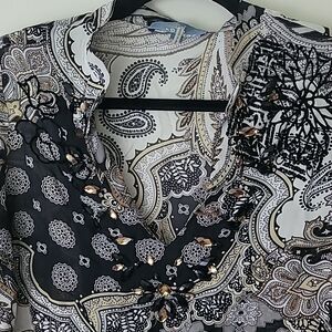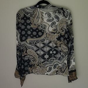 Halé Bob Lounge 100% Silk Sheer Paisley Print Blouse w/ Slit Bell Sleeve. V-neck with Black and gold jewls. Colors are Black, white, beige, and gray. Absolutely Stunning. Excellent condition. Size Medium.