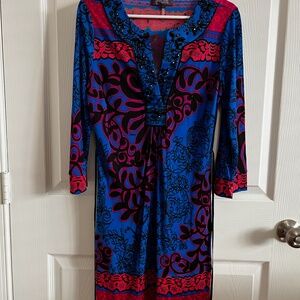 100% silk, size small. Design on front is off center, and more centered in the bag. Slight snagging in fabric. Dry clean only.