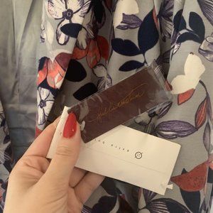 This floral print Hal Rubenstein blazer comes with tags still attached. Slightly Flared Collar. Unwrapped button on front and comes with an extra button.