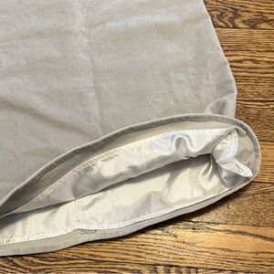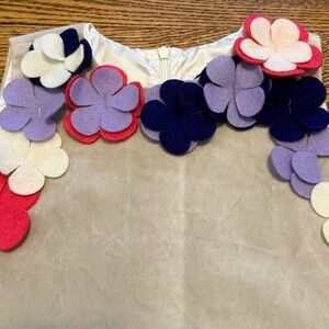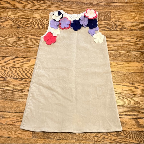 Halabaloo light gray velvet shift/jumper with pink, purple and white felt flowers at neckline. Size 7. Back zip closure, fully lined. GUC for NFO. Some markings, discoloration along seam down back of dress. Not noticeable when worn. Great for special occasions!