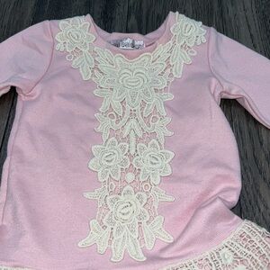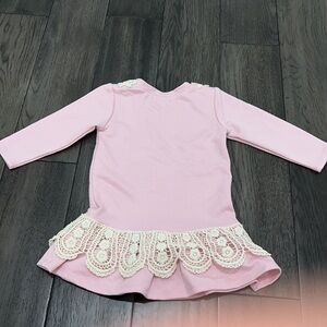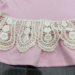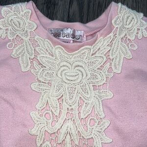 Gently used no rips or stains seen, light pink, long sleeve, sweater dress. Flares out from the bottom, has crochet lace design from the front side and around the skirted area. Feel free to bundle with other items for better pricing.