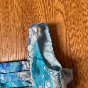 Halabaloo blue watercolor print with silver metallic details all over dress also has big bow on the back with a low back detail.