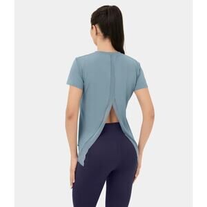 Halara Womens Lightweight Split Hem Back Lightweight Contrast Mesh Vented Split Back Short Sleeve Activewear Tee Dusty Blue New With Tags No Flaws of Note 88% Polyester, 12% Elastane Size S Approx. Measurements: Pit to Pit: 18 Inches Length: 27 Inches