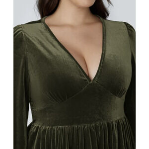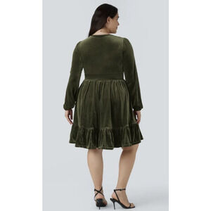 Halara Dress Womens 1X Green Velvet Plus Size V Neck Long Sleeve Ruffle Hem Mini