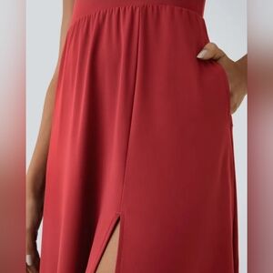 Stylish red sleeveless midi dress with a slit. Perfect for casual outings.