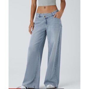 This is a pair of Halara Flex Asymmetric Low Rise Pockets Baggy Wide Leg Washed Casual Jeans.