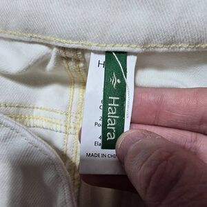 Details: stretchy, zip fly, front and back pockets, factory rolled hems, wide leg, relaxed fit