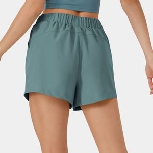 High Waisted Elastic Waistband Drawstring Side Pocket Casual Shorts 3" in Shadow Blue. New with tags. Women's size M or medium, real measurements shown in photos with shorts laid flat: