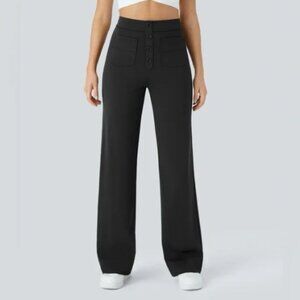 Halara High Waisted Straight Leg Pants Sz Medium Tall Black Button Front Pull On