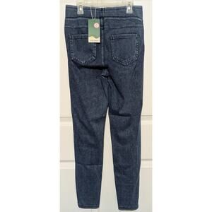 Design details: Wide elastic waistband, faux fly front and front pocket seams, functional back patch pockets, ankle-length skinny legs, jeans look with legging comfort.