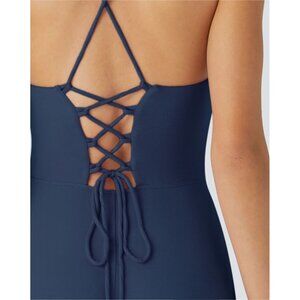 This is a Halara Ribbed Cowl Neck Backless Crisscross Lace Up Split Midi Party Dress.
