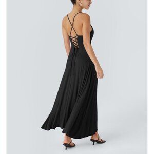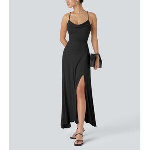 This is a Halara Ribbed Cowl Neck Backless Crisscross Lace Up Split Midi Party Dress.