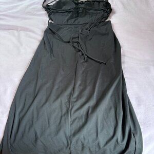 Cute ruched bodice backless dress with a corsetty criss cross thing going on in the back in a size large. very cute but ultimately not my style so never worn other than brief try on. in a stretchy workout/spandex material