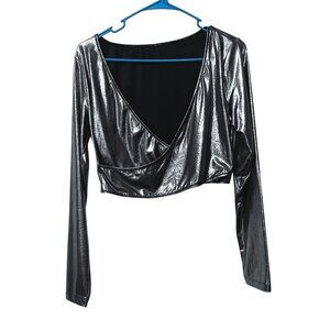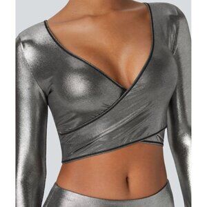This is a Halara Softlyzero Faux Leather Deep V Neck Cropped Meta Top. Crossover Hem Long Sleeve