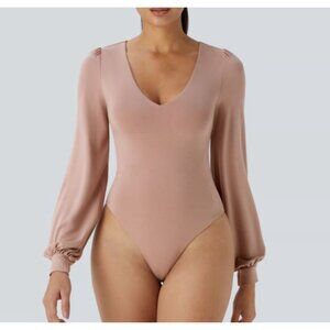 Halara V Neck Long Sleeve Button Work Bodysuit Sz Large Womens Pink