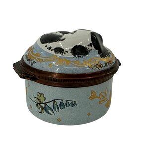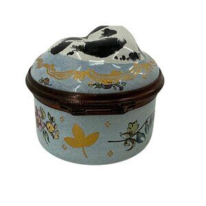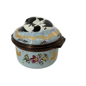 Halcyon Days Enamel Trinket Box With Black & White Dog Illustration Floral Desig
