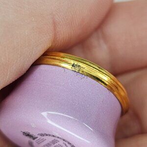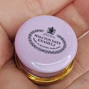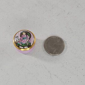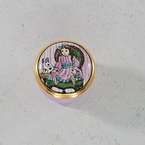A charming trinket box made by Halcyon Days Enamels in Bilston, England. Featuring a Victorian girl doll and dog design on a pastel pink background.