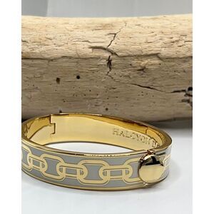 The cream & gold chain enamel hinged bangle measures 0.5" wide and is easy to match, lightweight and the perfect accessory for any occasion, either as a single item or stacked with other bangles. The timeless, contemporary design is finished in 18ct gold plate and features the Halcyon Days branding on the inside. It is available in a selection of vibrant and classic colours.