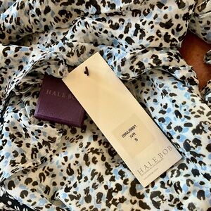 This chic silk and viscose dress by Hale Bob features a striking black, blue and white animal print, perfect for a casual night out. The wrap design with a V-neckline and 3/4 bell sleeves adds a touch of elegance, while the lightweight fabric ensures comfort and style. Its flattering silhouette cinches at the waist, making it a versatile addition to any wardrobe.