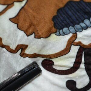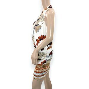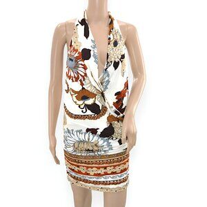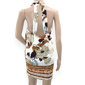 Offered is this darling dress by Hale Bob. The dress is an uber-stretchy white & florals with draped plunge bust, demi-open halter back, and bodycon fitted skirt. The dress was machine washed so the rust & brown colors bled a bit into pale yellow - this appears across most of the dress but blends in with the florals OK. One small spot under the arm. Otherwise in gently pre-owned condition with average, moderate wear.