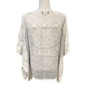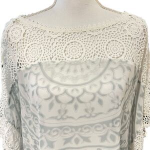 Hale Bob Lace Short Sleeve Tunic Top MED Crochet Trim Grey White Boho Feminine