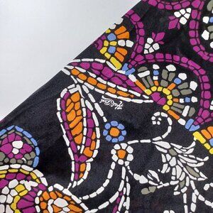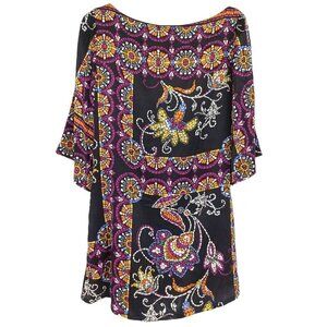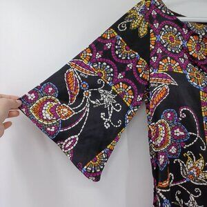 Hale Bob Black Silk Mosaic Print Tunic Top Blouse Beach Cover Up Multicolor Flared Sleeves Floral Boat Neck Keyhole Tie Neck Relaxed Fit Flowy Half Sleeve Pockets Lightweight Breathable Stretch Women's