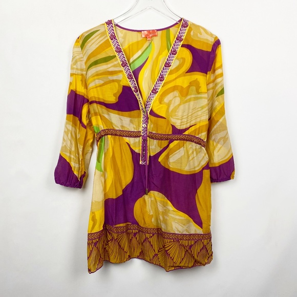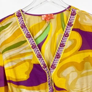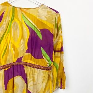 yellow , green and purple embroidered embellished tunic coverup in an airy gauzy fabric