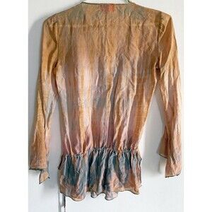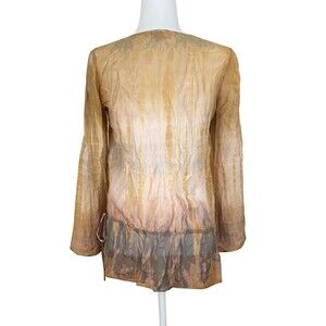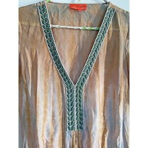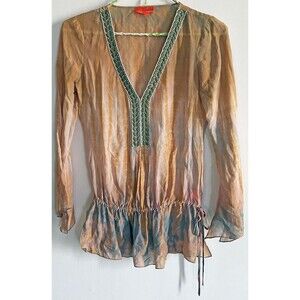 Hale Bob Cabana Silk Tunic Top Embellished Neckline Drop Waist Sheer Size XS. Ethereal, flowy tunic top is in very good pre-owned condition. 100% silk in earthy shades of mustard brown, tan and gray. Features deep v-neckline embellished with tiny ivory and oval olive green beads. Elastic drop waist features faux drawstring tie on left side. Flutter split bell sleeves. Measurements laying flat: 29 inches in length from shoulder to hemline; 22 inches from shoulder to elasticized drop waist; 18 inches armpit to armpit; sleeves measure 22.5 inches in length. Item comes from smoke-free , cat friendly home.