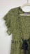 Longline cardigan in an olive green and black marled knit is quirky and fun with crocheted ruffled cap sleeves and hem. Closure is an empire waisted front tie with black satiny ribbons. Ribbons are laced through knit at neckline as well. Top part is a chunky open knit pattern and bottom part is a tight knit pattern. Hits below hips for flattering silhouette.