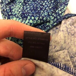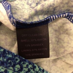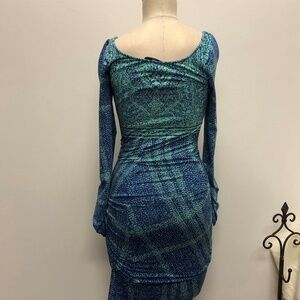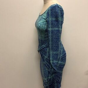 Hale Bob blue and aqua colored print, tight fitted long sleeves 24" from shoulder to the wrist. The fabric is bunched up on the sleeve end. This dress is 36" from the shoulder to the bottom hem and it is very stretchy.