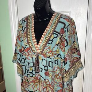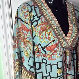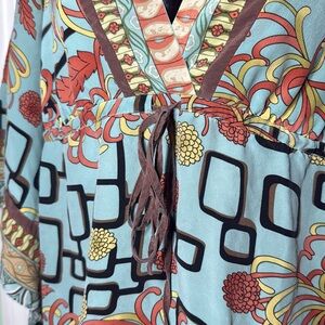 Hale Bob Floral 100% Silk V-Neck 3/4 Sleeve Empire Waist Boho Gypsy Top Size Med
