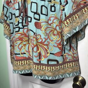 Stylish floral V-neck silk top with a vibrant floral design. Perfect for adding a pop of color to your wardrobe. 3/4 Bell sleeves. GUC No stains or rips, 2 picks on upper right sleeve. Not very noticeable. Check photos.