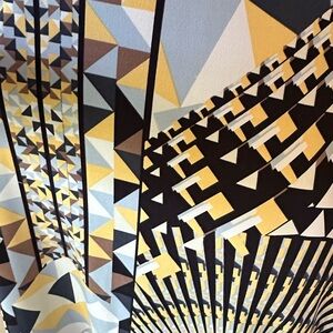 Condition with no flaws to note. Comes with removable sash that can be worn around the neck, as a belt or you can leave it off altogether. Stretchy polyester and spandex blend fabric in a nice geometric print. Fully lined.