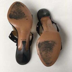 HALE BOB sexy high heels slip on sandals in black with beautiful turtle embellishment. Heel height is approximately 4-1/4”. Stunning rhinestone turtle embellishment in the front as well as rhinestone details on straps. Size 37(EUR), fits 6.5-7 (US). Very good condition, just minor wear on bottom soles, new heel bottoms on both shoes. One heel has been professionally reinforced at a high end shoe repair (paid $40 for the job) and it actually improved stability of the shoe!