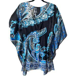 Hale Bob Lounge top. If you love boho, this is for you. Poncho-like and flowing. Beautiful pattern and sophisticated color palette of black, blues, and grays. Like new.