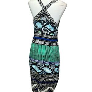 This stylish women's dress features a vibrant multicolor pattern, perfect for any occasion. The dress combines shades of black, blue, and green, creating a unique and eye-catching look. Ideal for adding a pop of color to your wardrobe.