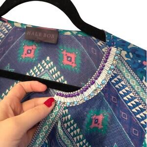 Hale Bob S 100% Silk Flowy Tunic Top $278 Beaded Button Collar Boho Blouse Blue