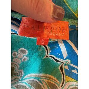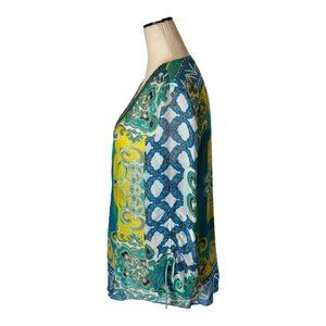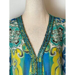 Hale Bob Shirt Women Small Green Blue Silk Beaded V Neck Ruched Sleeve Blouse