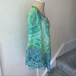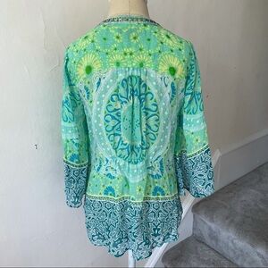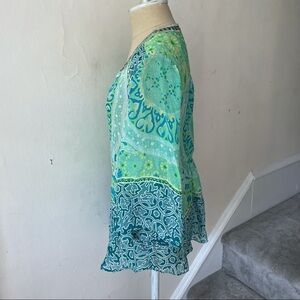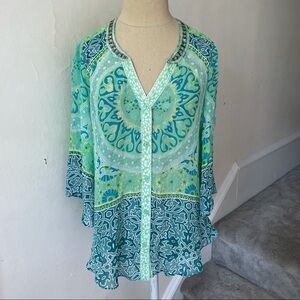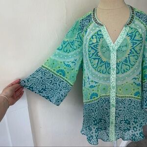100% silk flowy button down blouse from Hale Bob. 3/4 sleeve. Beaded collar. A couple of minor pulls in fabric but in overall good condition. Inventory: a53t*m