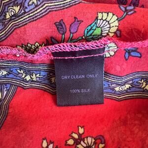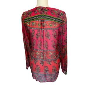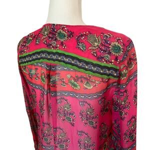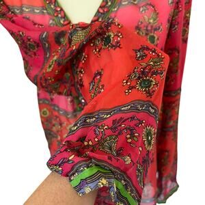 Hale Bob "Skye" jewel-embellished blouse crafted in 100% silk. Features a vibrant pink and red floral boho print with beadwork along the neckline. Lightweight and flowy with a tunic silhouette, V-neckline, and long sleeves.