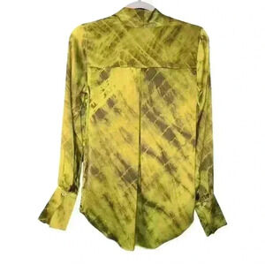 Hale Bob Tie Neck Button Down Blouse. Size XS. Buttons are concealed and only go down halfway on the blouse. High-low. Abstract Goldish-yellow with brown print. 94% Silk, 6% Spandex. Minor staining on sleeve(see picures) Otherwise, good preloved condition! Dry-cleaned and ready to go♡