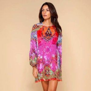 Stunning mini dress by Hale Bob. Features vibrant floral patterns. Long sleeves with tie details. Perfect for a bold look.