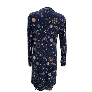 This stunning Hale Bob long sleeve midi dress in size XS combines cosmic elegance with everyday comfort. Featuring a celestial print with constellations, stars, and geometric patterns in navy and white, this dress stands out as a true statement piece. Made with a soft, stretchy rayon-spandex blend, it provides a flattering fit and effortless wearability. The button details and contrasting design add a touch of sophistication, making it perfect for casual outings, special occasions, or creative office wear.