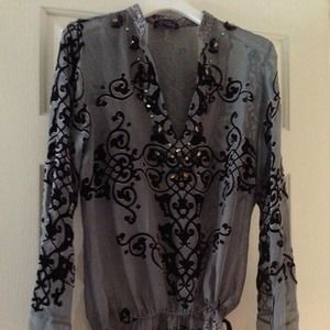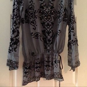 Unworn sheer semi tunic top with gem like embellishment, embossed velour prints, and side draw strings. Can be worn with leggings, or with dress pants. Can also be worn as swimsuit cover up😍
