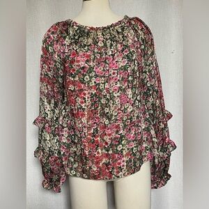 Dainty floral pattern with golden threads give it just enough sparkle. Long sleeves are semi sheer and have ruffles with an elastic hem at wrist. Neck is elastic and can be worn on or off shoulder Has self tie at neckline. Body of shirt is lined