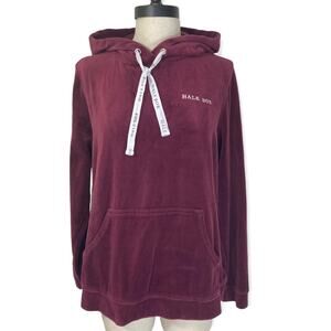 Hale Bob burgundy women's XL velour Hoodie pullover with kangaroo pockets. Embroidered chest logo, Hale Bob logo graphic drawstrings. Washable 77% cotton 23% polyester soft fabric. Excellent pre owned condition, no notable flaws.